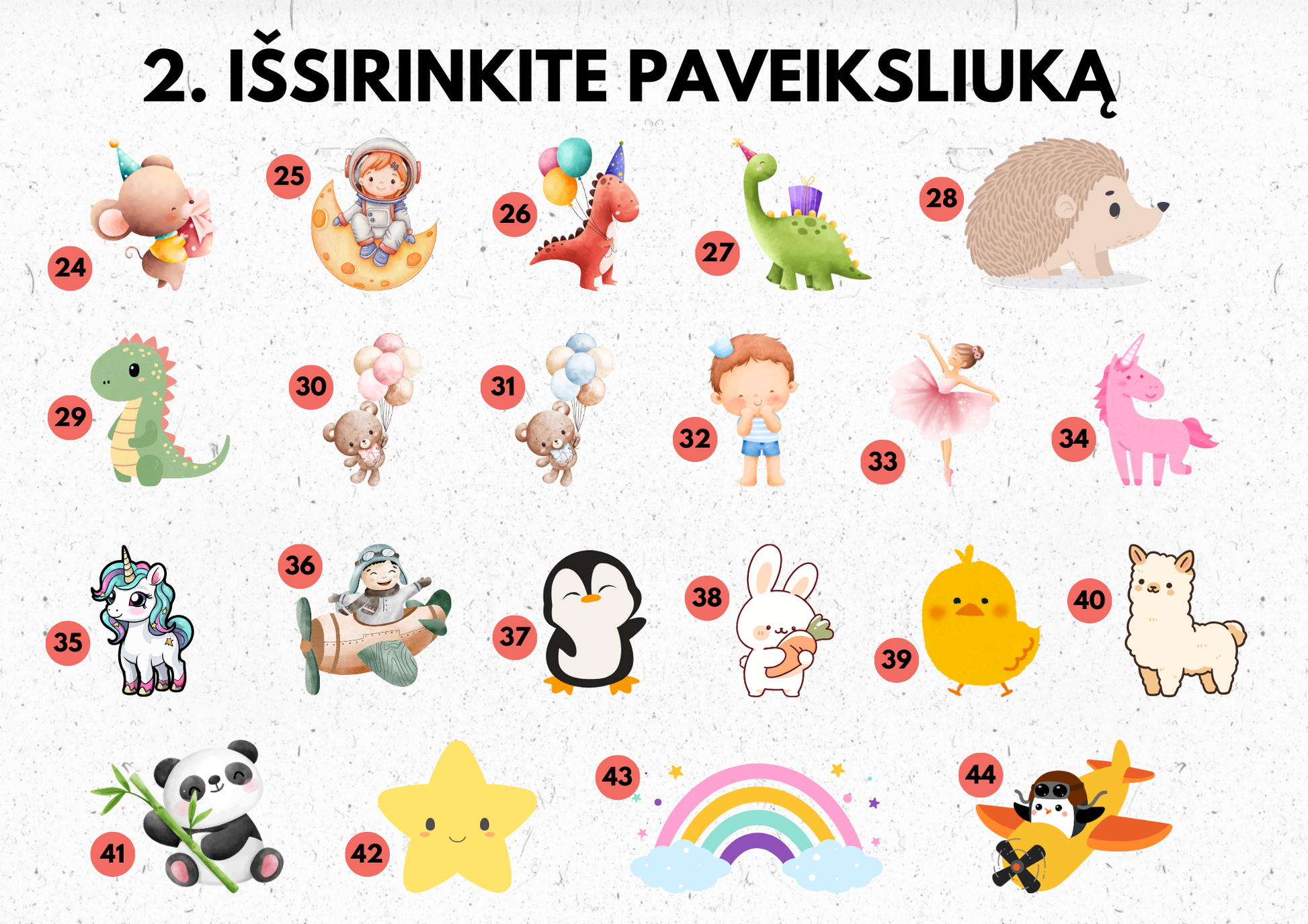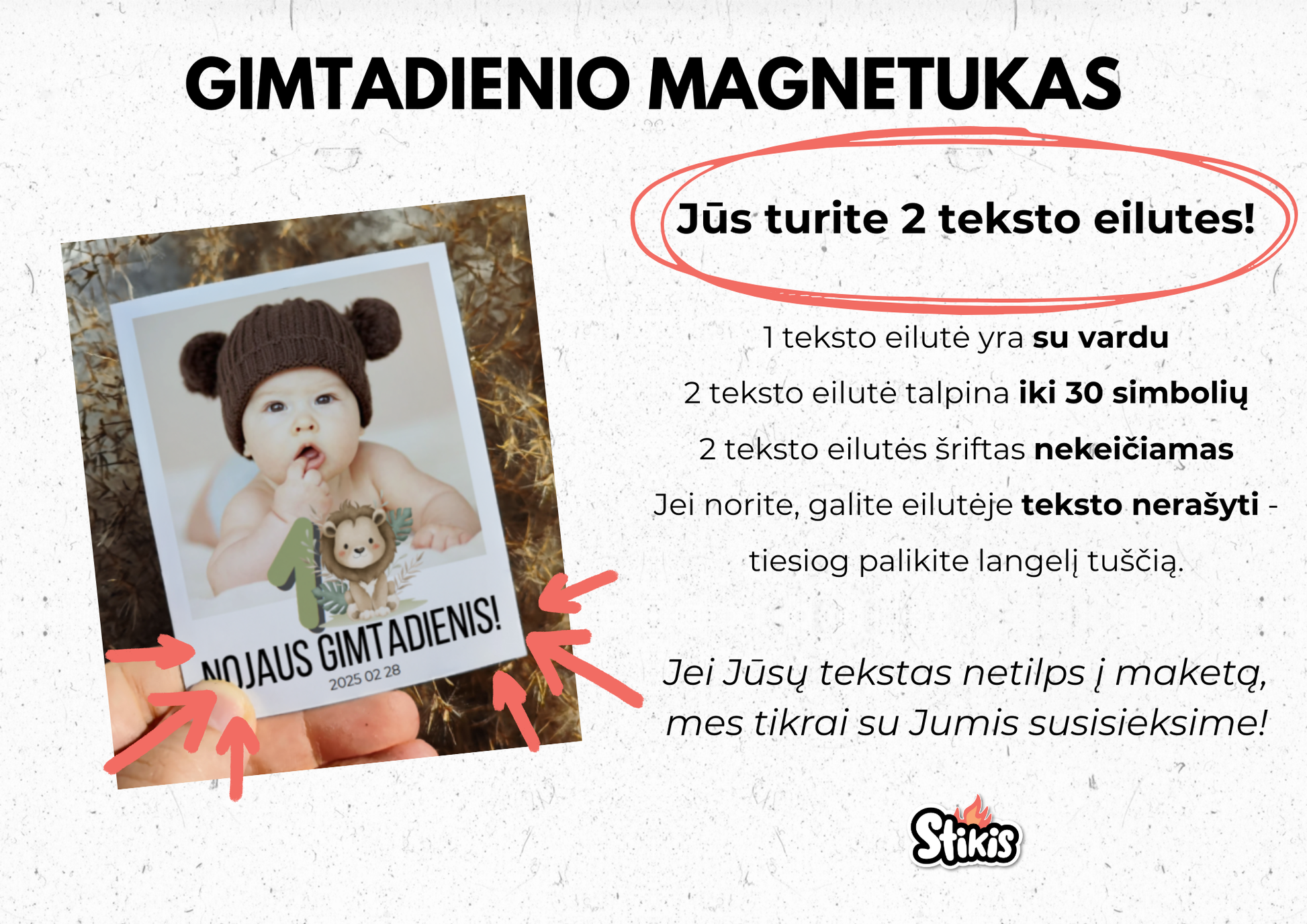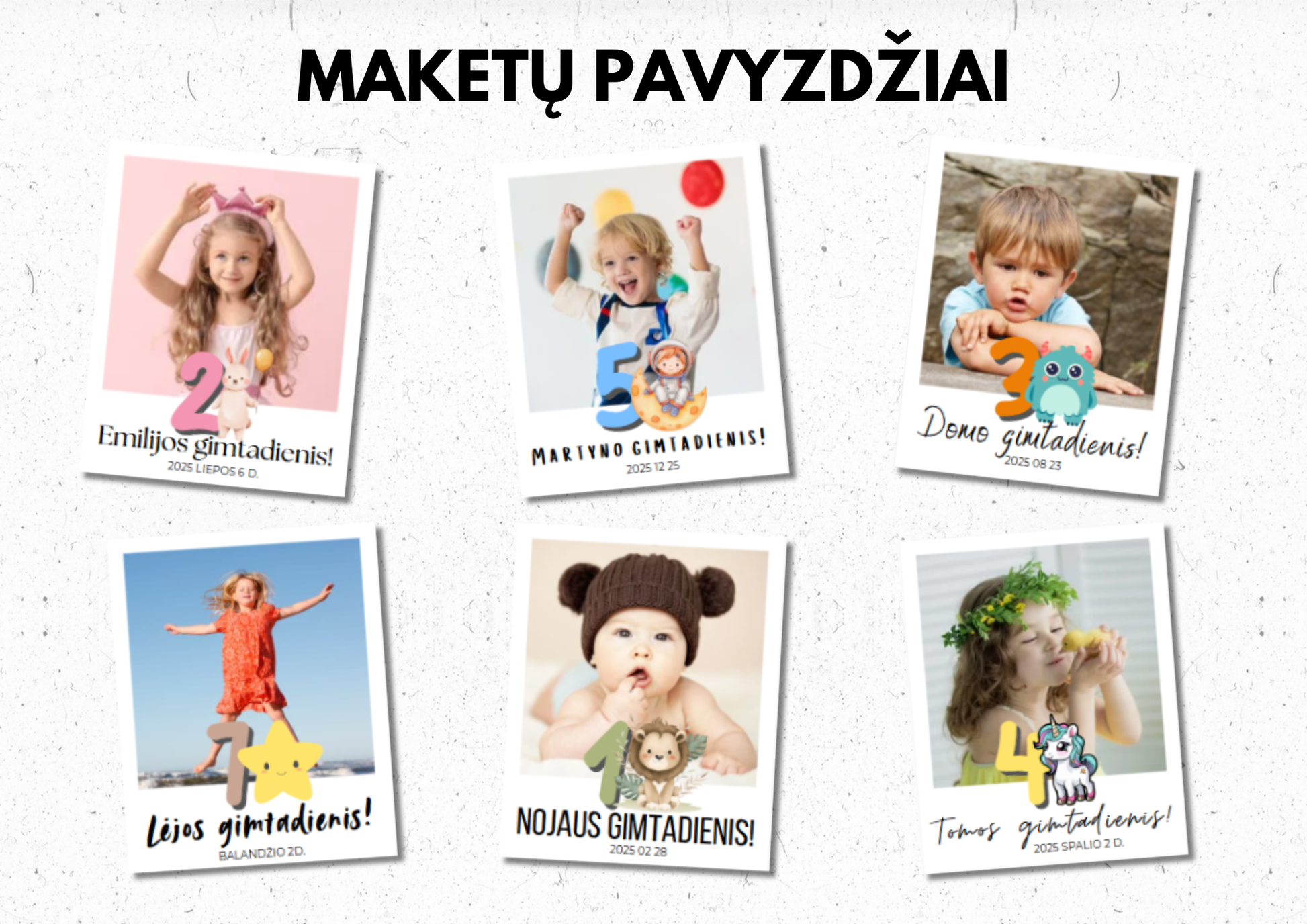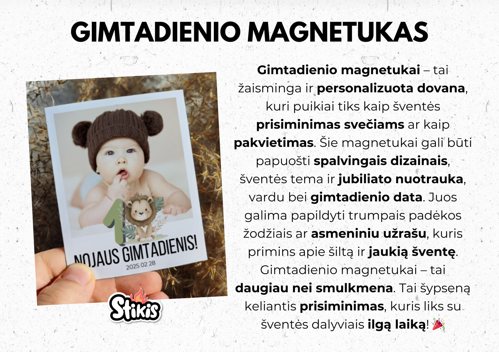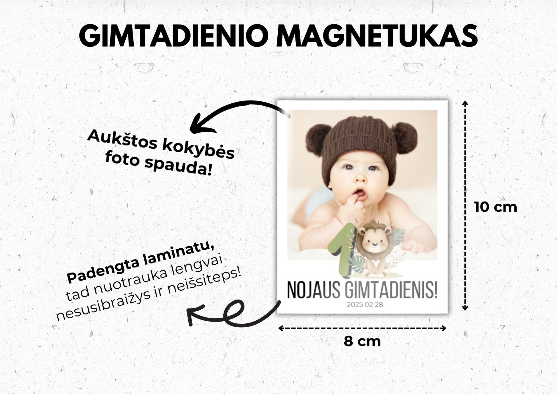 Kiekvienas magnetukas gali būti papuoštas šventės atributika, nuotrauka ir tavo pasirinktu tekstu 🎈. Nori parodyti, kiek tau metų? 🎁 Nori atspindėti temą – nuo vienaragio iki superherojų? 🦄🦸♀️ Mes pritaikysime dizainą pagal tavo viziją!