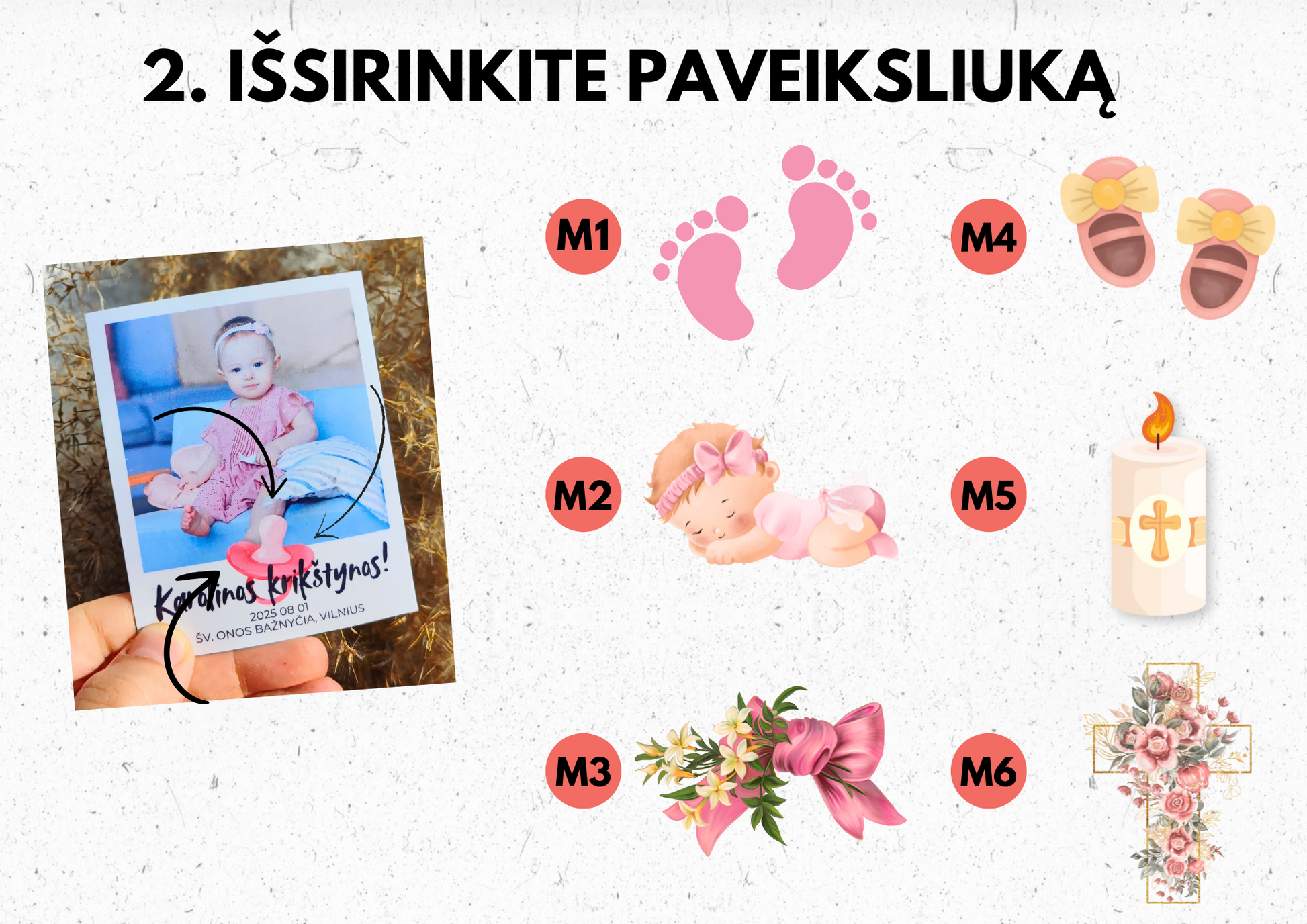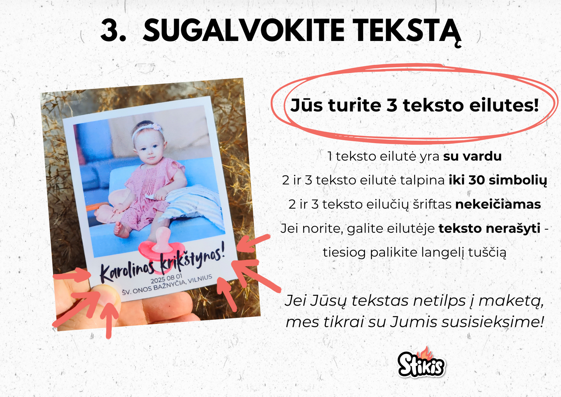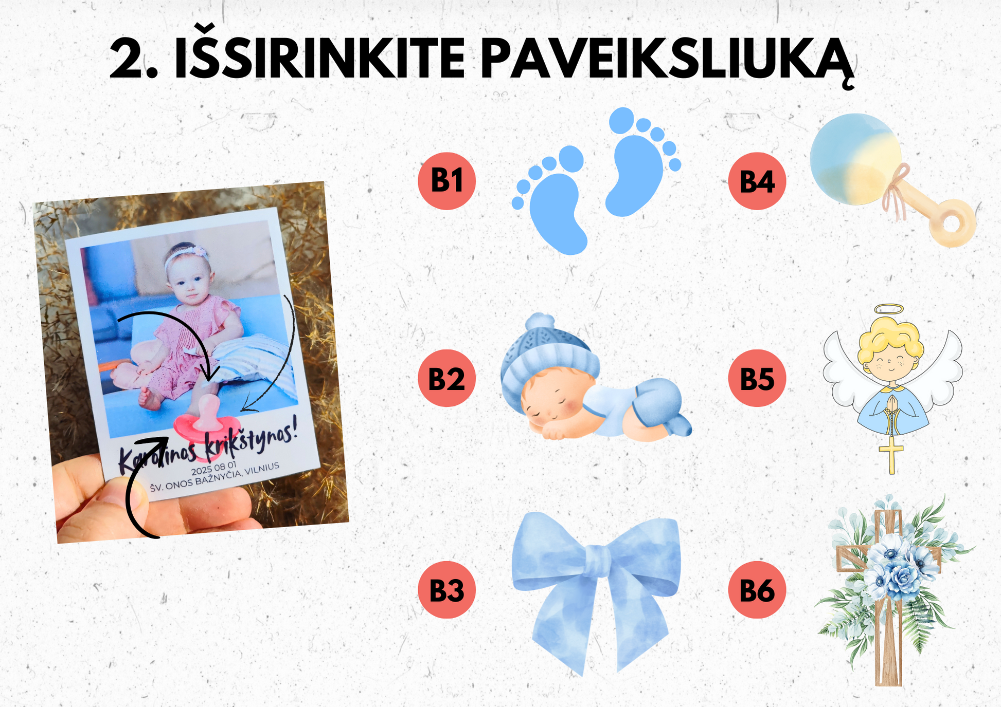 Galite pasirinkti kūdikio nuotrauką, vardą, datą ar trumpą palinkėjimą ✨ – ir mes sukursime individualų dizainą, kuris nudžiugins tiek svečius, tiek artimuosius.